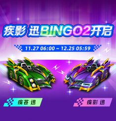 <疾影 迅BINGO2>今日限时开启!除“疾影 迅(无限制)”外,还有“疾苍 迅(无限制)”、“V1 终极车辆兑换券(1个)”、“超负荷稀有部件 迅(无限制)”、“V1心愿稀有车辆兑换券(1个)”一并作为本次BINGO2的最终奖励~